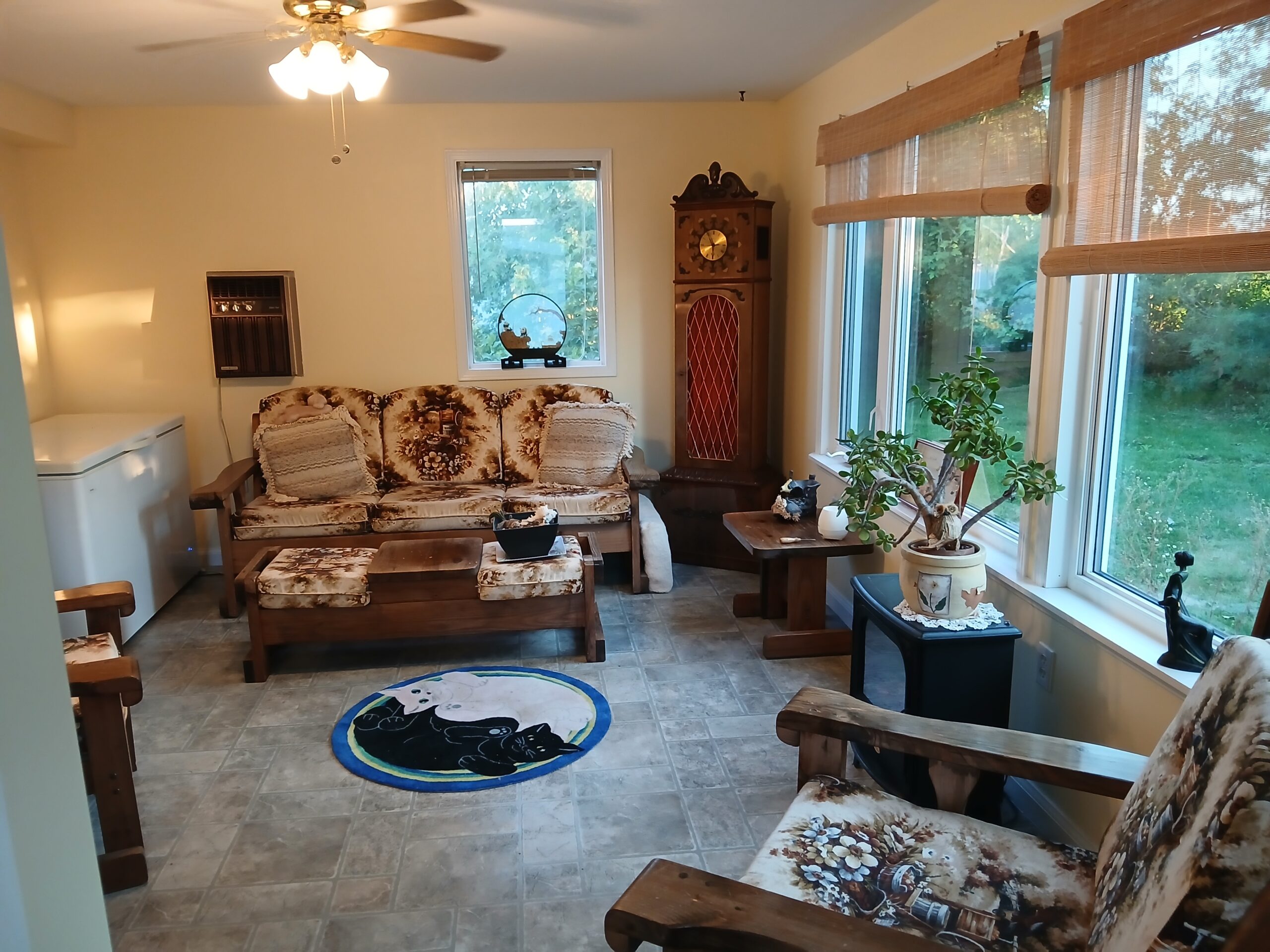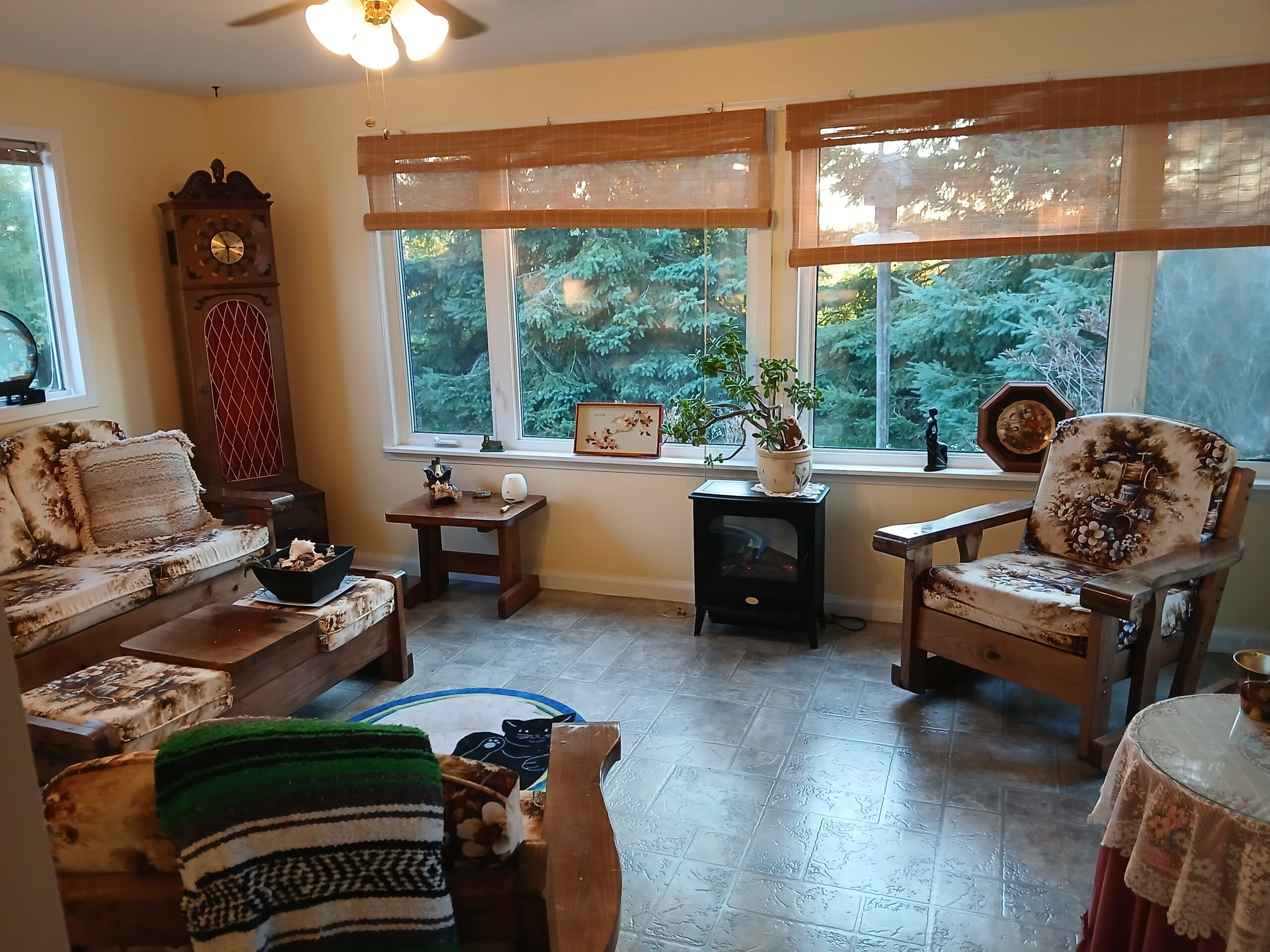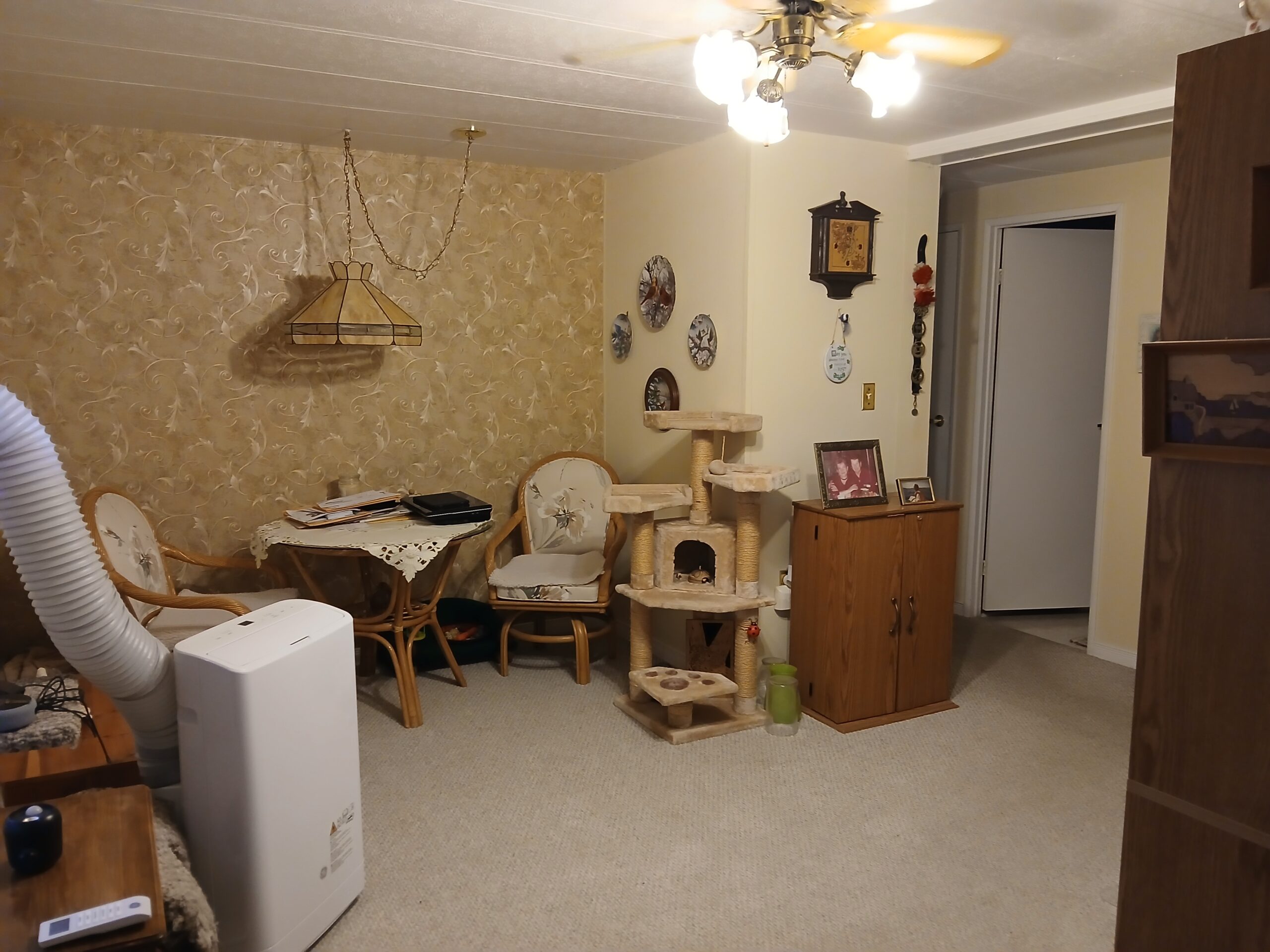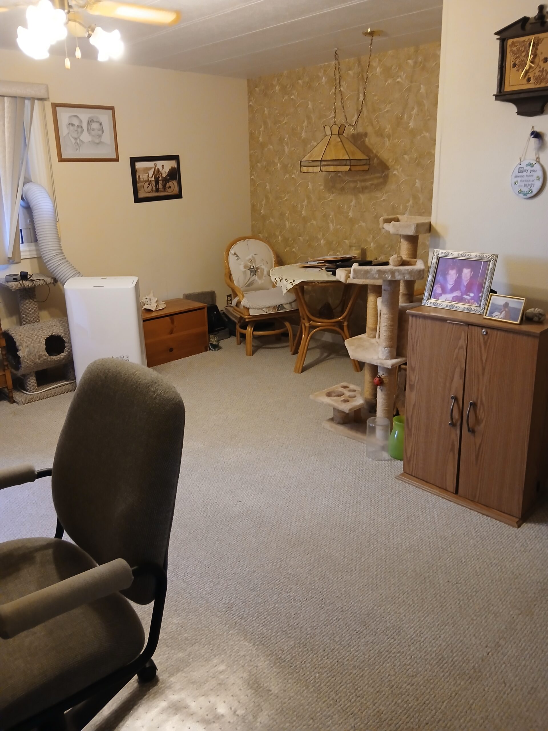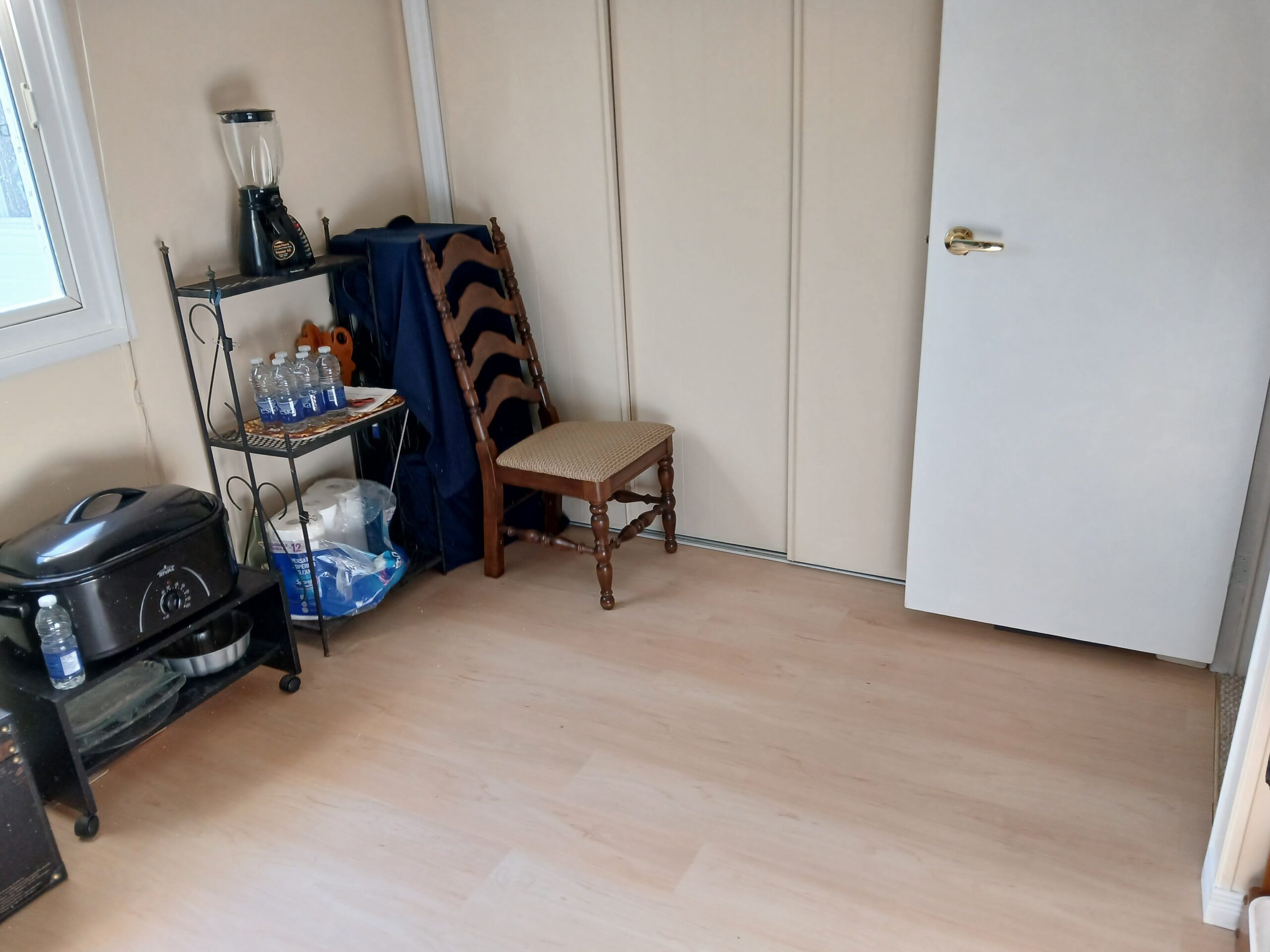 A lovely modular home in a year-round land-lease community, this 2-bedroom home is bright and spacious both inside and out. Have your morning coffee on the east-facing front patio and enjoy the sunset from the west-facing 4-season sunroom. The sunroom exits to the back deck and yard, which is extremely private and backs onto a field. There is a high, dry, and bright storage or work shed with windows, power, and a work bench, and a garden shed with power, shelving, and a work bench. There is a 1.5-car enclosed carport with access to the back deck. Inside you will find spacious rooms with good storage. There are two good-sized bedrooms, with the master having a large closet and the second having a built-in Murphy bed and storage. The front entrance divides the den and living room, with the dining area and galley kitchen towards the back of the house, and the sunroom which is off of the kitchen and the laundry nook.